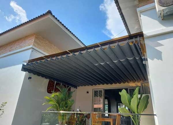 Mái che xếp được sử dụng cho khách muốn mở rộng không gian một cách chủ động, bất kể ngày nắng hay ngày mưa.